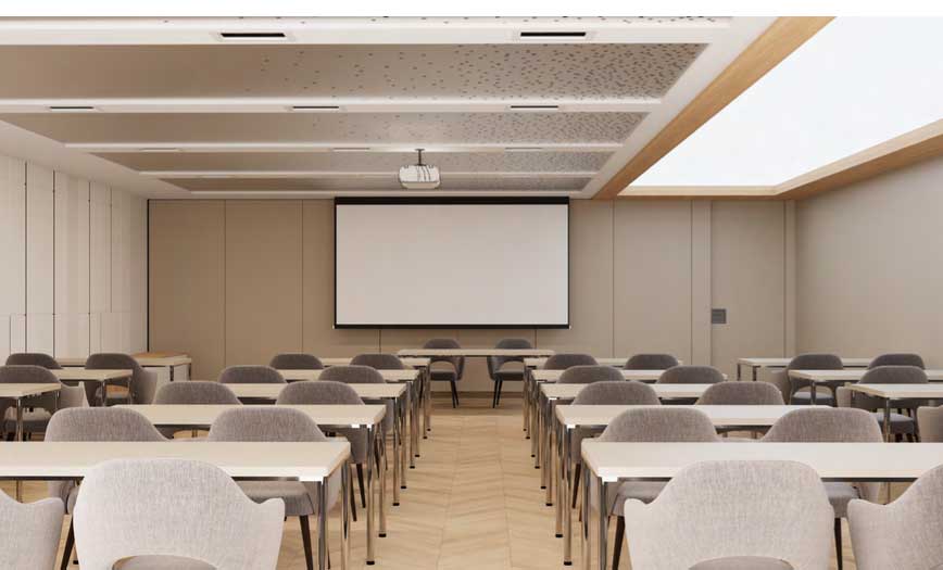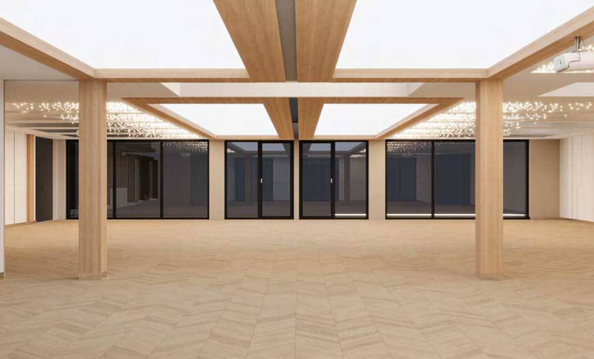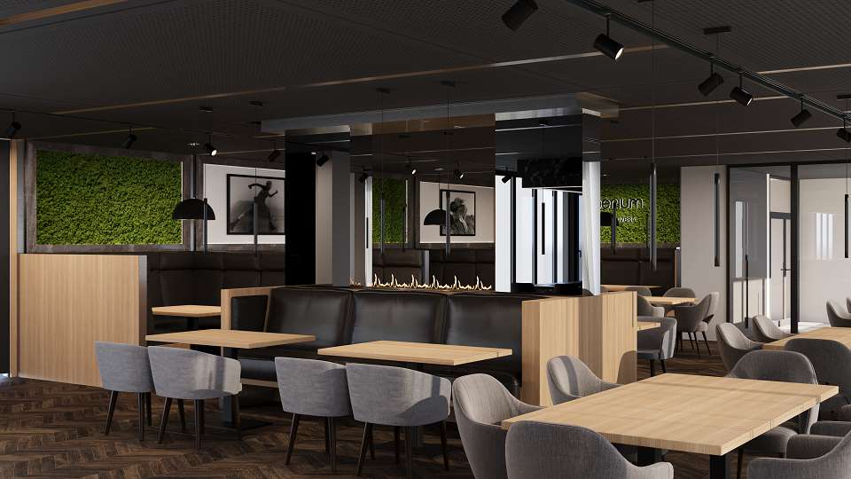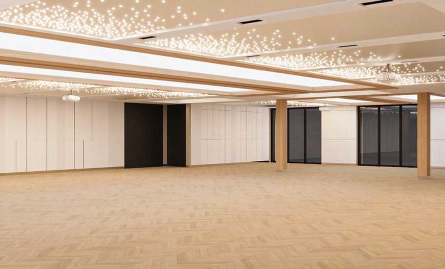 Der Speiseraum kann bei Bedarf um den Außenbereich, die Terrasse und einen Festsaal erweitert werden. Der Festsaal lässt sich durch elektrisch bewegliche Trennwände in kleinere Räume teilen, die für Präsentationen und Schulungen genutzt werden können. Die Umgestaltung der Flächen kann von einer einzigen Person in weniger als zwei Stunden durchgeführt werden.