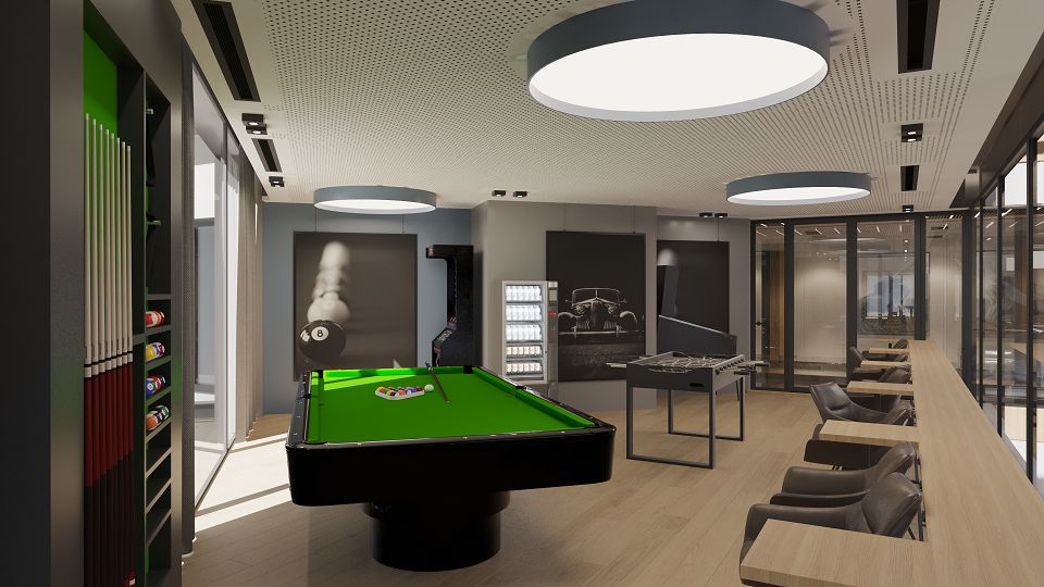 Das Mitarbeiterbistro bietet komfortable Sitzmöglichkeiten, Erfrischungen und Snacks, während die Lounge mit Blick auf den Innenhof und das Foyer ein geselliger Treffpunkt ist, um sich zu entspannen und den Kopf freizumachen. Das breite Unterhaltungsangebot ermutigt dazu, sich auch außerhalb der Arbeitszeit zu treffen, um Spiele mit Kollegen zu genießen und soziale Kontakte zu knüpfen.